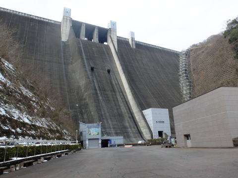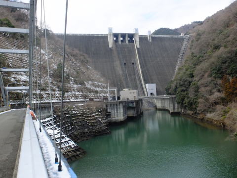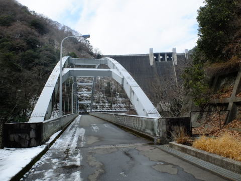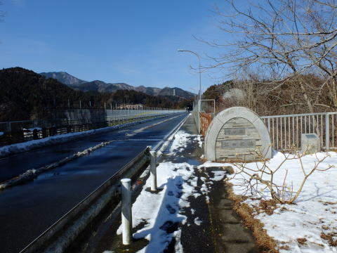吊り橋のたもとの小公園を抜けてバス道へ出て左へ、宮ケ瀬小中学校の前を通ってやまびこ大橋を渡り左へ、宮ケ瀬トンネル、梅の木トンネルを抜けてダム上の駐車場に入り、堰堤の上に出ます(下段左右)