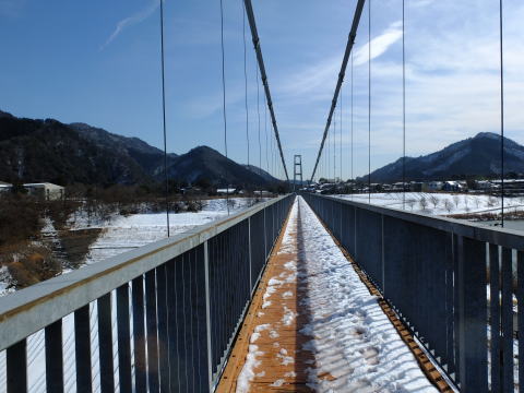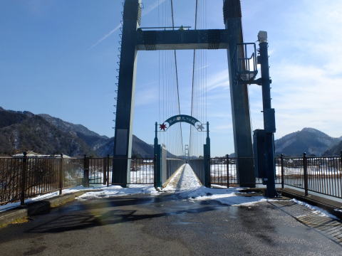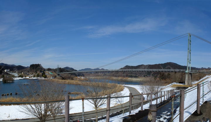 廻り込んで湖畔苑地に入り、水の郷交流館の屋上からの展望(最上段左右)を楽しんだ後、下の芝生広場へ降ります(第2段左)。芝生広場を左側から廻り込んで、大吊り橋を渡ります(第2段右から第4段右まで)。木の橋板が雪で濡れて滑るので慎重に歩きます。最下段のパノラマが渡ってから振り返る大吊り橋です